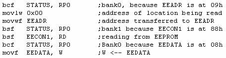 Setarea bitului RD initializeaza transferul de date de la adresa gasita în EEADR la registrul EEDATA. Ca si la citirea datelor nu avem nevoie de atât de mult timp ca la scriere, datele luate din registrul EEDATA pot deja fi folosite mai departe în urmatoarea instructiune.