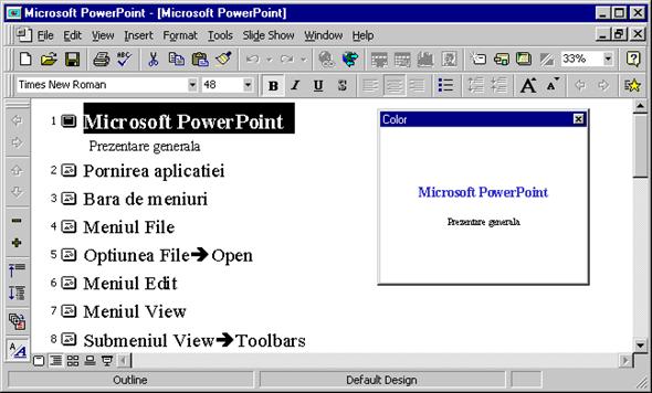 Puteti vedea oricare din aceste componente afisate pe ecran sau tipari copii ale acestora. In mod prestabilit, PowerPoint afiseaza diapozitivele dupa cum am aratat in figura anterioara. Paginile pentru scheme arata ca un rezumat obisnuit, cu titlurile principale aliniate la marginea din stanga si titlurile de pe celelalte niveluri indentate: