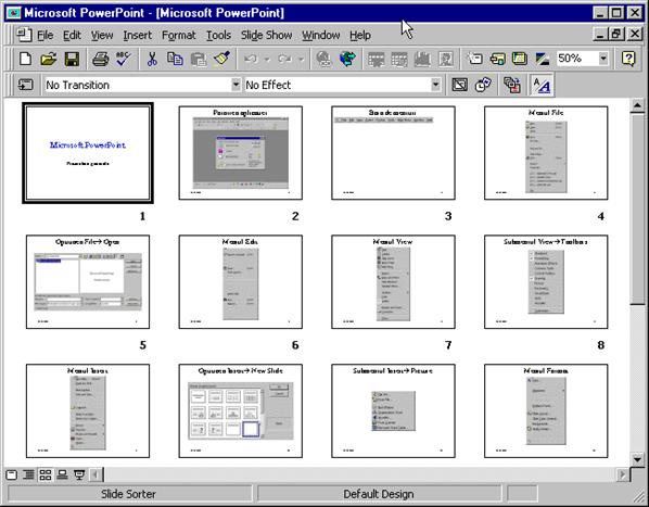 Modul de afisare Slide Sorter ofera o perspectiva asupra prezentarii prin afisarea unei versiuni in miniatura a fiecarui diapozitiv pe un singur ecran. Numarul de diapozitive pe care le puteti vedea simultan depinde de placa video, de programul driver si de monitorul calculatorului dumneavoastra, ca si de procentul de marire folosit. Cu cat este mai mic acest procent, cu atat mai multe diapozitive veti putea vedea.