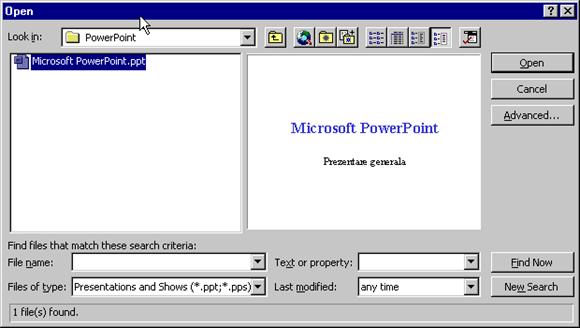 Prezentarile din PowerPoint pot fi deschise pot fi deschise prin aceeasi metoda folosita la deschiderea unui fisier din aplicatiile sub Microsoft Office:
