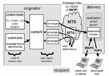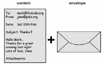Toate mesajele de posta electronica sunt compuse din mesajul īn sine (numit continut) si un plic (figura urmatoare). Plicul ofera o "eticheta" pentru mesaj, indicānd sistemului de transfer de mesaje (Message Transfer System - MTS) unde sa transmita mesajul, fara a fi nevoit sa-l deschida si sa inspecteze continutul. Īn realitate plicurile sunt doar simple date aditionale si comenzi de control, trimise īntr-un format standard catre MTS.
