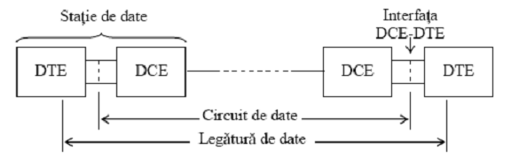 În figura anterioara este prezentata schematic o legatura de date - ansamblu compus din elementele a doua echipamente terminale de date (DTE - Data Terminal Equipment) care sunt controlate de un protocol si care, prin intermediul circuitului de date ce le interconecteaza, permit împreuna transferul datelor. Echipamentul terminal de date este acea parte a unei statii de date care serveste ca sursa de date, ori colector de date, sau si una si alta.