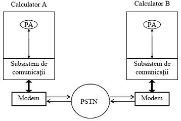 Daca ele sunt distantate se utilizeaza suport de transmisiune oferit de reteaua de telecomunicatii. Frecvent este utilizata în acest scop reteaua telefonica publica cu comutatie (PSTN - Public Switched Telephone Network) si este nevoie de un echipament, numit modem, pentru a adapta semnalele ce reprezinta datele la caracteristicile liniei de transmisiune (Fig. 4).