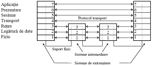 Primele trei nivele de jos sunt dependente de retea si protocoalele corespunzatoare acestor nivele opereaza între sisteme adiacente. Este posibil ca între sistemele de extremitate, cele în care ruleaza programele de aplicatie a caror cooperare este asigurata prin subsistemele de comunicatie interconectate, sa existe sisteme intermediare care actioneaza ca relee pentru datele transmise, dirijând datele de la un sistem la altul.