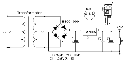Pentru a functiona corect sau pentru a avea o tensiune stabilizata la 5V la iesire (pinul 3), tensiunea de intrare pe pinul 1 la LM7805 ar trebui sa fie intre 7V si 24V. In functie de curentul consumat de montaj vom folosi tipul corespunzator de stabilizator de tensiune LM7805. Sunt diferite versiuni de LM7805. Pentru consum de curent de pana la un 1A ar trebui sa folosim versiunea in capsula TO-220 cu posibilitatea de racire aditionala. Daca consumul total este de 50mA, putem sa folosim 78L05 (versiune de stabilizator in capsula mica TO-92 pentru curent de pana la 100mA).