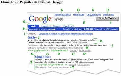 H. Bara de statistici - Aceasta linie descrie cautarea dvs. si indica numarul de rezultate gasite, precum si timpul necesar gasirii lor.