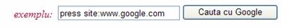 Unele cuvinte, când sunt urmate de doua puncte, au o anumita semnificatie pentru Google. Un asemenea cuvânt pentru Google este operatorul "site:". Pentru a cauta un anume domeniu sau site, folositi sintaxa "site:domeniuexemplu.com" în caseta de cautare Google. De exemplu, pentru a cauta informatii de presa pe site-ul Google, se introduce: