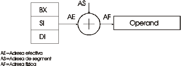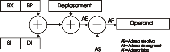 La continutul adresei de baza din bx se aduna deplasamentul S si se obtine offsetul operandului. Aceste tipuri de adresare se pot folosi c nd avem structuri de date care pot fi localizate in diferite locuri din memorie.Reg. de baza va contine adresa de inceput a structurii iar deplasamentul va furniza adresa elementelor din structura