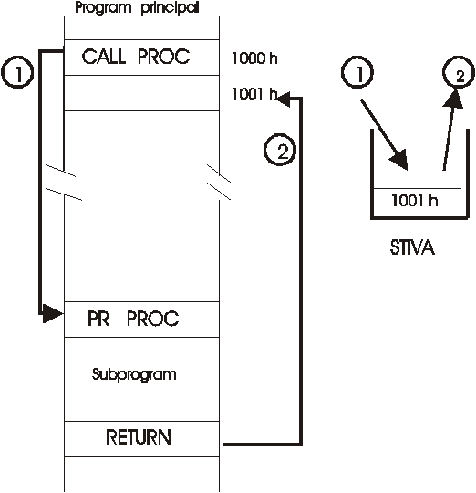 Stiva se foloseste pentru a memora aceasta adresa de revenire. Microprocesorul este proiectat astfel inc t automat la executia unui apel de procedura (CALL) salveze in stiva urmatoarea adresa de memorie care contine instructiunea urmatoare din secventa ( de fapt continutul registrului IP). C nd se int lneste in subrutina instructiunea de RETURN (revenire din subprogram) tot automat mP ia din v rful stivei adresa gasita si o incarca in registrul IP (pointerul de instructiuni) execut nd apoi, instructiunea gasita la aceasta adresa (adica instructiunea de la adresa 1001).