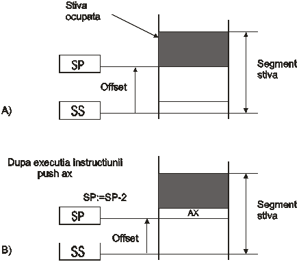 O zona de stiva este caracterizata de o adresa curenta numita adresa v rfului stivei (top stack) si care la mP 8088 este adresata prin registrul SP (stack pointer - indicator de stiva). Registrul de segment SS (Stack Segment) va indica adresa de inceput a segmentului de stiva in memoria sistemului. Deci si pentru stiva este alocata implicit o zona de 64 Kocteti (lungimea standard a unui segment ! ). Operatiile de baza cu stiva sunt PUSH (depune un cuv nt in stiva) sau POP (extrage un cuv nt din stiva