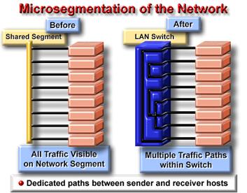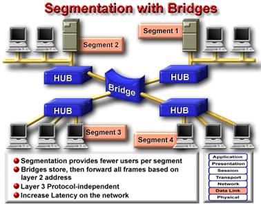 . Un bridge, sau un switch, micsoreaza traficul intre dispozitivele conectate la segmente , deoarece doar anumite pachete sunt distribuite mai departe . Amandoua dispozitivele actioneaza precum un firewall pentru eventualele erori ale retelei . De asemenea permit comunicarea intre mai multe dispozitive decat ar fi fost posibil in cazul unui LAN cu dispozitivele conectate la un singur bridge . Bridge-urile si switch-urile extind reteaua , permitand atasarea statiilor . Desi bridge-urile si switch-urile au atribute comune , exista si deosebiri intre ele . Switch-urile sunt mult mai rapide datorita comutarii la nivel hardware , in timp ce bridge-urile realizeaza comutarea la nivel soft . Un LAN Ethernet la 10 Mbps si un LAN Ethernet la 100 Mbps pot fi interconectate folosind un switch in locul unui bridge . Switch-urile pot suporta densitati ale porturilor mai mari decat bridge-urile . Switch-urile reduc coliziunile la nivel de segment de retea , pentru ca aloca lungime de banda pentru fiecare segment in parte . Segmentarea realizata