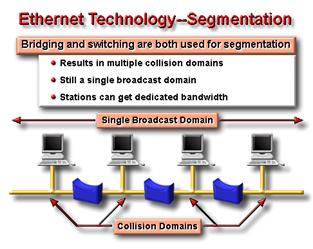Oricum acesta ramane un domeniu de emisie . Repeater-ul extinde domeniul de coliziune , in loc sa-l reduca prin segmentare . Switch-ul principal divide reteaua Ethernet EO Ethernet in mai multe segmente de retea , fiecare avand asigurata intreaga latime de banda . Switch-ul workgroup-ului imparte segmentul workgroup-ului . De asemenea notati ca switch-urile asigura o buna conectivitate benzilor nepartajate . Hub-ul nu segmenteaza partea sa de retea . Router-ul segmenteaza intregul LAN in doua segmente Ethernet , si segmente token-ring si FDDI , care, prin natura lor nu sunt domenii de coliziuni . |