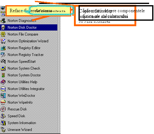 *Norton Disk Doctor(ne spune starea discului optiuni de autoreparare sau manual ce vreau sa repar;ne intreaba daca avem un disc cu situatia inainte de reparare(UNDO)