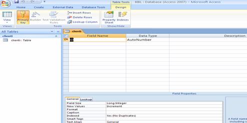 Pentru a stabili campurile tabelului si proprietatile acestora se deschide tabelul in modul Design View(butonul View din figura de mai sus). In modul Design View se vor introduce pe rand cimpurile tabelului si apoi proprietatile acestora (Figura 4).
