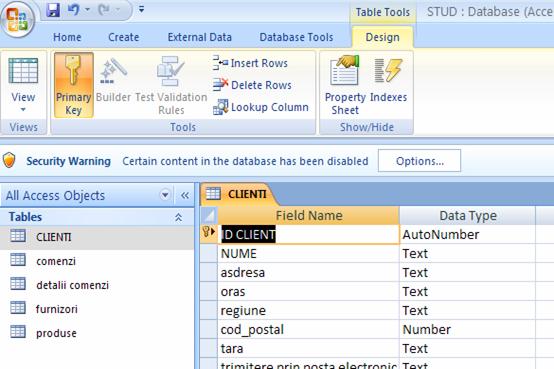 Regimul Design View nu permite introducerea īnregistrarilor īn tabel, ci doar descrierea cīmpurilor care alcatuiesc tabelul.