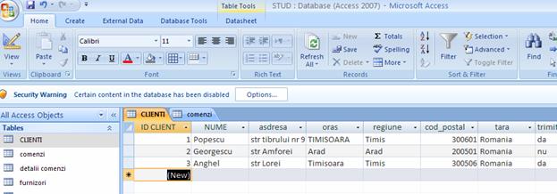 Se insereaza un tabel nou īn baza de date i se deschide īn vizualizarea Foii de date (Figura 3).