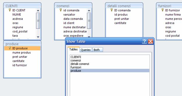 o fereastra (fig.8) īn care indicam tabelele īntre care se stabilesc relatii,apoi, cu ajutorul mouse-ului, trasam legaturile īntre cīmpurile respective.
