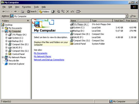 Utilizarea programelor Windows Explorer si My Computer sunt aproape identice. Singura diferenta intre cele doua programe este modul de afisare a dosarelor si fisierelor. Astfel, in timp ce programul Windows Explorer le afiseaza utilizand o fereastra cu doua celule, programul My Computer le afiseaza intr-o singura fereastra (Fig. 3. 6). Diferenta poate fi eliminata daca activati My Computer/Explorer Bar/Folders).