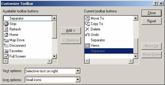 Rezultatul este afisarea unei ferestre de dialog in care utilizatorul poate selecta (Available toolbar buttons:) comenzi pe care sa le adauge barei de instrumente, apasand butonul Add, sau poate indeparta anumite butoane din bara cu instrumente (Current toolbar buttons:) prin selectarea acestora si apasarea butonului Remove. La incheierea tuturor operatiunilor se apasa butonul Close (Fig. 3. 12).