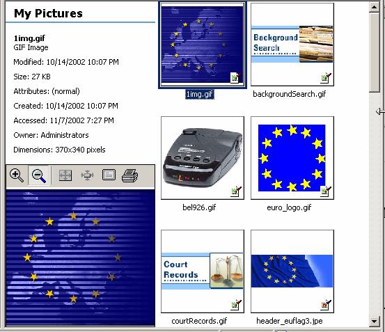 Optiunea Thumbnails este utila mai ales in situatia in care fisierele continute in directorul curent contin imagini. Continutul acestora este afisat sub forma unei imagini mai mici, permitand o identificare mai usoara a fisierului cautat, iar in partea dreapta sunt afisate informatii despre fisier (numele, data modificarii, dimensiunea, data crearii si cea a ultimei accesari, dimensiunile), precum si o varianta marita a acestuia (Fig. 3.20).