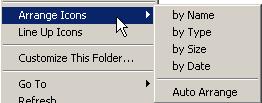Pentru a usura activitatea de navigare prin directoare si fisiere, ambele programe permit aranjarea obiectelor in fereastra din dreapta dupa anumite criterii: nume (by Name), tip (by Type), dimensiune (by Date) sau automata (Auto Arrange). Aceste optiuni pot fi selectate din submeniul Arrange Icons (Fig. 3. 23).