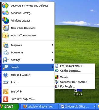 Este important de observat ca am precizat doar programul Windows Explorer. In situatia activarii optiunilor My Computer/Explorer Bar/Folders programul My Computer va aparea exact ca si programul Windows Explorer (cu doua ferestre). Implicit fereastra din dreapta afiseaza optiunea Folders. In situatia activarii optiunii Search, fereastra va afisa meniul de cautare a fisierelor/directoarelor/calculatoarelor/persoanelor sau in Internet (Fig. 3. 14).