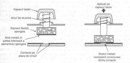 În momentul apasarii comutatorului, o folie conductoare aflata în partea inferioara a elementului de spuma închide un circuit de pe placa de circuit care se gaseste dedesubt. Un arc de revenire împinge înapoi tasta, dupa ce apasarea a încetat. Elementul de spuma deschide contactul, ajutând la evitarea oscilatiilor, dar, da acestor tastaturi o senzatie de inconsistenta. Cea mai importanta problema legata de acest tip de comutator de tasta este faptul ca nu asigura un raspuns tactil puternic. Sistemele care dispun de acest tip de taste recurg uneori la trucuri, cum ar fi emiterea unor semnale sonore care imita clicul tastaturii, indicând închiderea contactului. Firma Compaq a folosit tastaturi de acest tip în multe dintre sistemele sale. O alta problema legata de acest tip de comutator de tasta este corodarea foliei conductoare si a contactelor de pe placa de circuit care se gaseste dedesubt. Când se întâmpla asa ceva, apasarile de taste pot deveni intermitente, lucru care poate fi suparator.