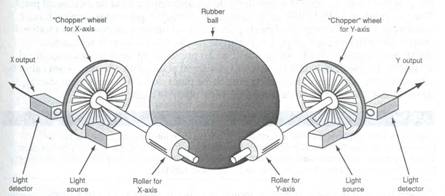 Intern, un mouse este foarte simplu. Bila este plasata între doua rotite, una pentru transformarea miscarii pe axa X, cealalta pentru axa Y. Aceste rotite sunt de obicei legate de doua discuri cu fante, care permit trecerea luminii. Mici senzori optici detecteaza miscarea rotitelor, urmarind fascicolul de raze infrarosii care trece prin fantele rotitelor, pe masura ce acestea se rotesc. Aceste esantioane de lumina sunt transformate în miscare de-a lungul axelor. Acest tip de mecanism este denumit mecanism opto-mecanic si este cel mai folosit în prezent (vezi figura).
