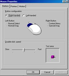 La aceasta fereastra se ajunge alegând din Control Panel optiunea Mouse si apoi eticheta Buttons. De aici se poate selecta modul de functionare al mouse-ului: pentru mâna dreapta (Right-handed) sau pentru mâna stânga (Left-handed). În cazul mouse-ului standard cu doua butoane, utilizat în Windows, butonul din stânga este cel principal. El este folosit la selectare si tragere, în timp ce butonul din dreapta este butonul secundar, care asigura accesul la meniurile de context si la alte caracteristici speciale.