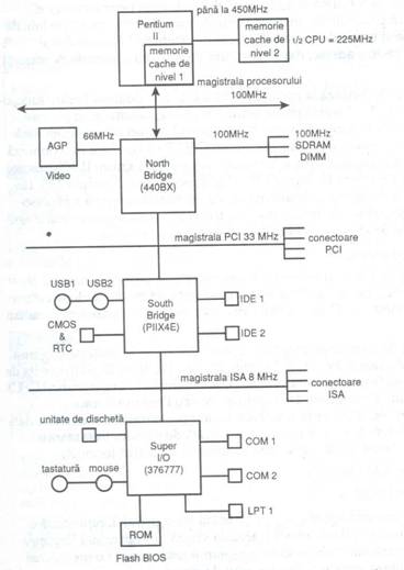 În figura este reprezentata arhitectura tipica a unui sistem Pentium II, cu diferitele niveluri ale magistralelor din sistem: