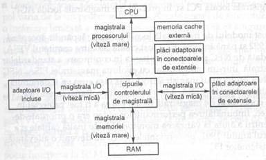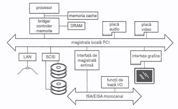 Magistrala PCI (Peripheral Component Interconnect) a fost lansata în 1992 si modificata în 1993. Ea a fost obtinuta prin reproiectarea magistralei traditionale prin intercalarea unei alte magistrale între CPU si magistrala I/O existenta reprezentata prin cipuri de legatura (bridge). S-a preferat ca în loc sa se intre direct pe magistrala procesorului, sa se puna la punct un nou tip de cipuri controller pentru a extinde magistrala. În figura este reprezentata schema de principiu a magistralei PCI.