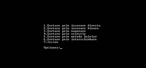3. Meniul principal ofera apoi, utilizatorului, optiuni in privinta metodei de sortare a vectorului: