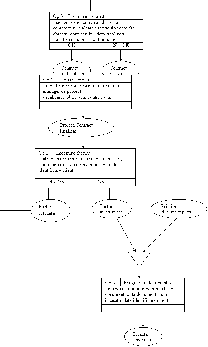 Clientul transmite o cerere de oferta adresata societatii Dateck SRL. Compartimentul Contractare analizeaza cererea si daca serviciile solicitate de catre client pot fi prestate īn conditiile mentionate se īncheie contractul de prestari servicii. Contractul īncheiat este transmis catre compartimentul Gestiune Proiecte care este responsabil cu derularea proiectului. La finalizarea acestuia serviciul Contractare va emite factura catre client. Aceasta va fi īnregistrata īn contabilitate numai dupa ce a fost avizata si semnata de catre conducere.