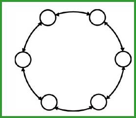 Se dezvolta din structura BUS, fiind construita tot in jurul unei resurse comune (mediul fizic de comunicatie) dar are o fiabilitate mai mare. Ea se construieste prin conectarea tuturor nodurilor participante cu nodurile adiacente (vecinii) pana la formarea unei bucle (inchisa). Remarcam deja o usoara crestere a costurilor ca urmare a aparitiei a cate doua interfete per nod.