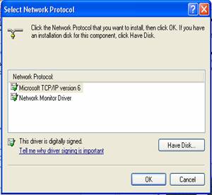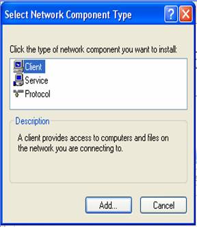 .Pentru a adauga un nou protocol,se executa clic pe butonul Install Va aparea caseta de dialog Select Network Component Type. Aceasta caseta asigura trei optiuni:Client, Service si Protocol: