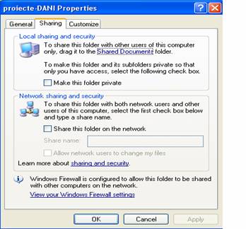 Partajarea fisierelor se face asemanator.Se da clic dreapta pe fisierul ce se doreste sa fie partajat(muzica,jocuri,etc.),se selecteaza Sharing.Apare caseta de dialog Sharing,clic stanga pe Share This Folder,se bifeaza casuta, se poate da un nume folder-ului,se poate specifica o parola si nivelul de acces pentru dosar(Read Only sau Full). Fisierul partajat va avea sub el o mana.