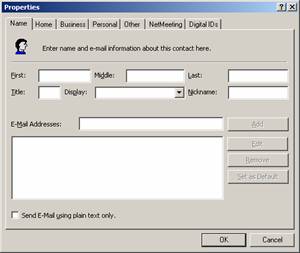 clic pe butonul New din bara ferestrei si din lista optiunea New Contact. Apare caseta de dialog Properties.