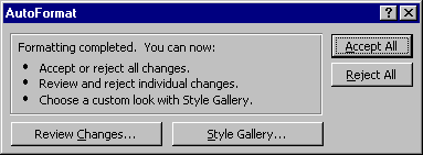 6. &nb 11511b121l sp; Se poate alege Accept pentru a accepta toate modificarile, Reject All pentru a refuza toate modificarile sau Style Gallery pentru a alege un alt stil AutoFormat.