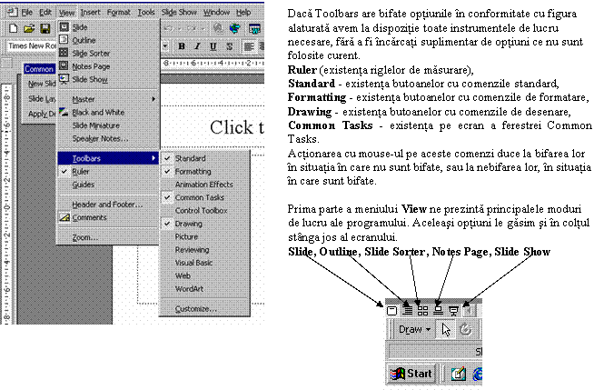 Pentru a ne asigura de concordanta intre cele scrise in aceasta platforma si aspectul interfetei utilizator verificam meniul View, comada Toolbars.