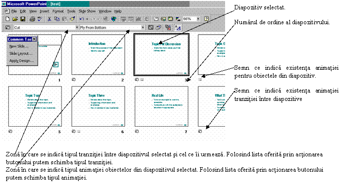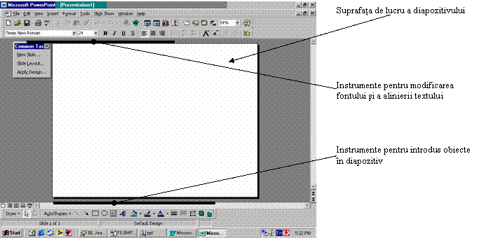 Este modul de lucru in care realizam diapozitivul. Acesta ne este oferit la o dimensiune maxima de lucru suprafata diapozitivului si ne sunt oferite toate uneltele necesare compunerii diapozitivului. In figura urmatoare este prezentat aspectul general al programului in modul de lucru Slide.