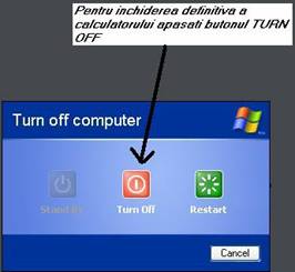 Dupa efectuarea programului de lucru calculatorul trebuie inchis. Pentru oprirea corecta a sistemului de operare va trebui sa apelati functia Shut Down(Turn Off) din meniul Start existent pe bara din partea de jos a ecranului (Taskbar).