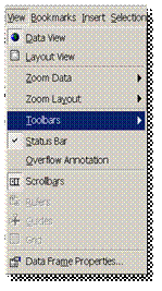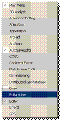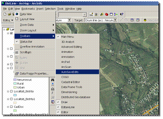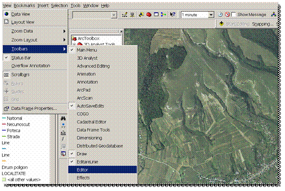 Pas2. Din meniul standard al aplicatiei, dati click pe View, si alegeti Toolbars pentru a deschide bara de instrumente cu care veti lucra in vectorizarea elementelor de tip linie: drumuri, rauri. Apoi bifati bara de instrumente EditareLinie.