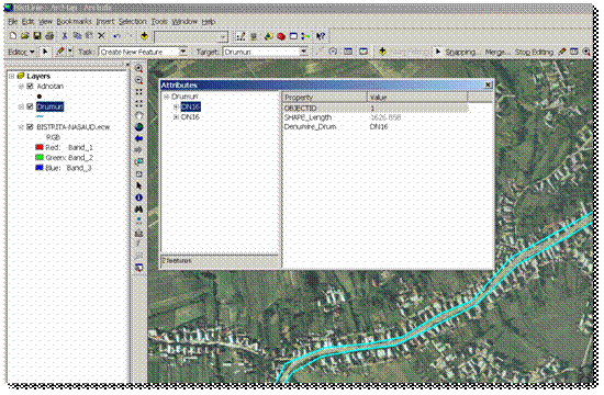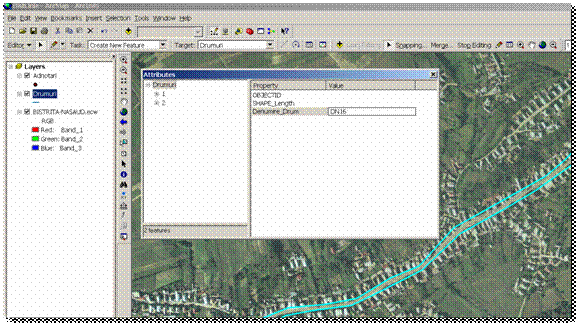 Pas 14. Se deschide fereastra Attributes, iar aici, avand selectat layer-ul din partea stanga a ferestrei, in coloana Value, din partea dreapta, veti edita atributele liniilor vectorizate, pentru fiecare camp din coloana Property.