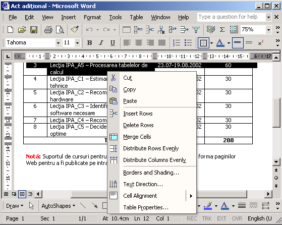 Pentru a insera în tabel o linie, plasati punctul de inserare în linia în