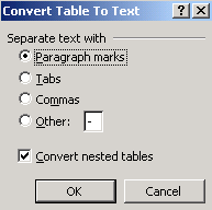 Sa presupunem ca ati introdus un material si dupa aceea va decideti ca ar fi mai bine sa îl prezentati sub forma de tabel. În acest caz, nu este necesar sa introduceti din nou informatiile respective; le puteti transforma în tabel. Tot ceea ce trebuie sa faceti este sa va asigurati ca textul pe care doriti sa-l transformati în tabel contine o serie de marcaje, cum ar fi marcajele de paragraf sau tabulatoarele, pe care Word sa le poata folosi ca sa-si dea seama unde începe o coloana noua.