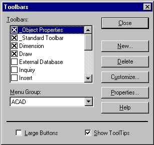 În AutoCAD 14, caseta de dialog Toolbar are doua întrebuintari: prezinta toolbar-urile selectate si le personalizeaza.