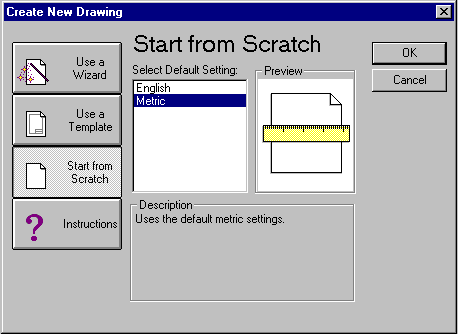 Cele doua optiuni disponibile pentru setarile corespunzatoare unui nou desen sunt Quick Setup Wizard si Advanced Setup Wizard. Ambele optiuni sunt lansate împreuna cu fisierul prototip curent, dar parcurgând fiecare din aceste optiuni, anumite setari sunt facute pentru fiecare dintre acestea. În functie de scala desenului dumneavoastra, sunt ajustate setarile pentru dimensionare si pentru înaltimea textului. Setarile realizate cu ajutorul unui wizard pot fi, de asemeni, modificate în timpul sesiunii de desenare.