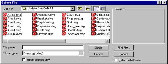 Optiunea Open a Drawing afiseaza caseta de dialog Select File. Aceasta caseta de dialog va permite selectia unuia din ultimele patru desene deschise sau a optiunii More Files cu care puteti alege orice alt desen existent în sistem.