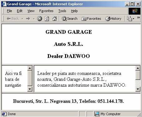 <!--index.htm--> <html> <head> <title>Grand Garage</title> </head> <frameset rows="150,*,20%"> <frame src="antet.htm"> <frame src="continut.htm"> <frame src="adresa.htm"> </frameset> </html> |