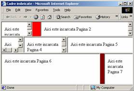 <html> <head> <title>Cadre imbricate</title> </head> <frameset rows="50,*,50%"> <frameset cols="25%,*" border="30" bordercolor="red"> <frame src="Pagina1.htm"> <frame src="Pagina2.htm"> </frameset> <frameset cols="*,2*,3*" > <frame src="Pagina3.htm" scrolling="yes"> <frame src="Pagina4.htm" scrolling="auto"> <frame src="Pagina5.htm" scrolling="no"> </frameset> <frameset cols="*,100" border="15"> <frame src="Pagina6.htm"> <frame src="Pagina7.htm" bordercolor="maroon" noresize> </frameset> </frameset> </html> |